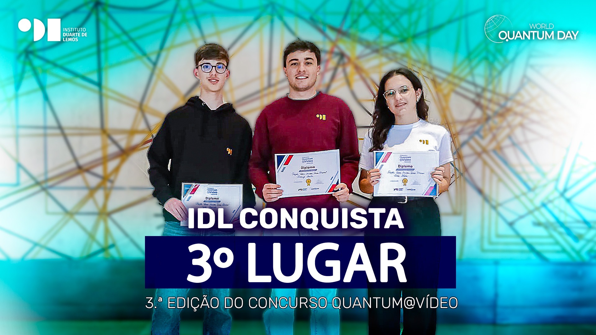 A equipa do Instituto Duarte Lemos, composta por quatro estudantes do 12º ano, destacou-se na 3.ª edição do concurso Quantum@Vídeo, alcançando 3.º lugar no Prémio do Júri, ex aequo com três escolas: Agrupamento de Escolas Rafael Bordalo Pinheiro, Escola Secundária Henriques Nogueira e Escola Secundária de Moimenta da Beira. A iniciativa, promovida pelo PQI – Portuguese Quantum Institute e pela REQ – Rede de Escolas Quânticas, desafiou estudantes do ensino secundário e profissional a explicar temas da Física Quântica de forma criativa, clara e cientificamente rigorosa. A edição deste ano contou com 67 trabalhos, envolvendo mais de duas centenas de estudantes oriundos de Portugal e Brasil, no que constituiu uma celebração internacional da ciência em língua portuguesa. O vídeo premiado “Dois Mundos, Duas Físicas foi desenvolvido pelos estudantes Diogo Pericão, Inês Neves, João Batista e Rodrigo Santos, do 12.º ano de Física, sob a orientação da professora Andreia Neves. Através da encenação de um noticiário, os alunos recorreram a uma abordagem criativa e acessível para explorar e esclarecer as principais diferenças entre a Física Clássica e a Física Quântica. Neste formato dinâmico, o vídeo conduz o espectador por dois “mundos” distintos: um regido por leis previsíveis e intuitivas, e outro marcado pela incerteza, pela dualidade e por fenómenos que desafiam o senso comum. Mais do que uma simples explicação teórica, o vídeo destaca-se pela sua capacidade de envolver, questionar e despertar curiosidade, demonstrando que a ciência pode ser simultaneamente rigorosa e criativa. Este prémio, numa iniciativa científica a nível internacional, reveste-se de grande significado para o Instituto Duarte Lemos, reforçando a importância da escola na promoção da literacia científica, do talento jovem e da inovação no ensino. A cerimónia de entrega dos prémios decorreu na passada terça-feira, dia 21 de abril, na Fundação Calouste Gulbenkian, em Lisboa. Nesse evento estiveram três dos quatro estudantes que constituíram a equipa do Instituto Duarte de Lemos, pois o Diogo Pericão não se pôde deslocar a Lisboa e ainda o Prof. Nuno Saraiva.